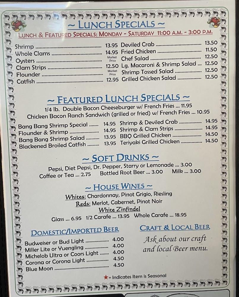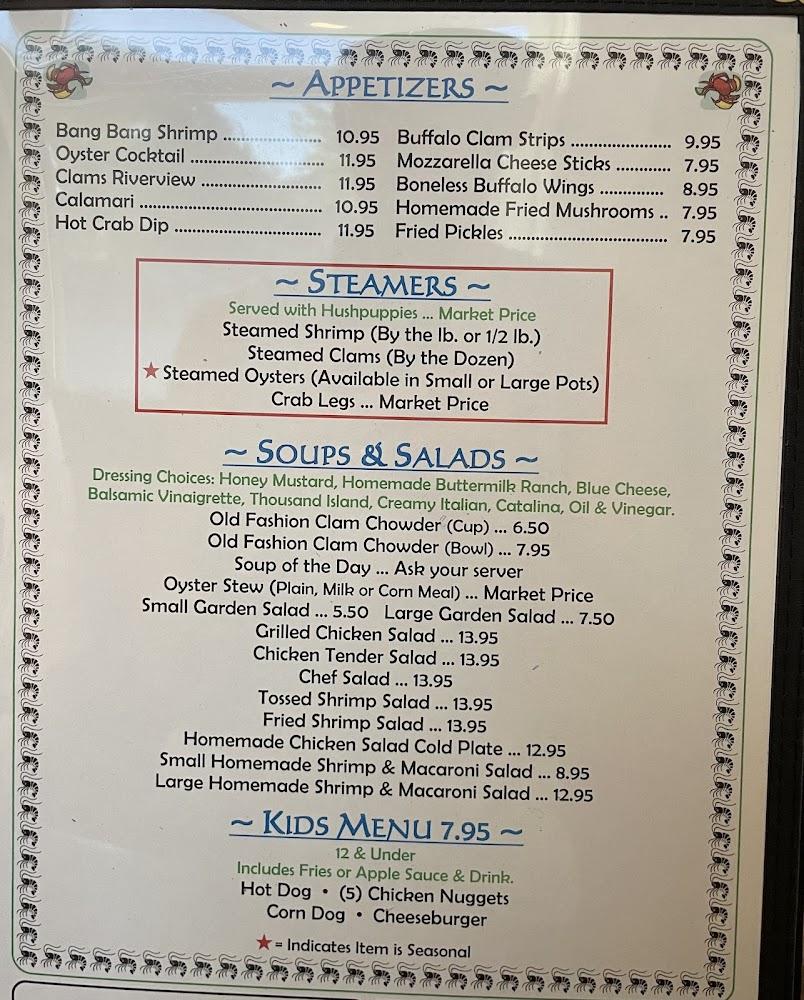 The menu at Riverview Cafe highlights a blend of traditional and modern seafood dishes. Fresh fish is the star, with options like fried flounder and grilled mahi-mahi. Appetizers such as clam chowder and hot crab dip set the tone for a hearty meal. The cafe serves a variety of burgers and sandwiches for those who want a break from seafood. A well-curated drink menu features local beers and wines. Kids' options are available, making it a family-friendly spot. For dessert lovers, the selection of pies adds a sweet closing note to the meal.